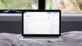 ベッドの上に置かれたノートパソコンでWordPressの投稿作成画面を表示している様子