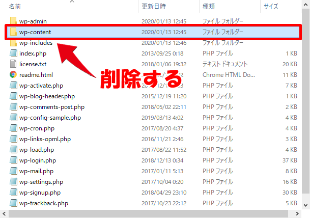 これらの2つのファイルはダウンロードした過去バージョンのWordPressによっては入っていないこともあります。その場合はwp-contentだけを削除すれば問題ありません。