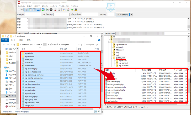 残ったファイルを全てFTPソフトでドラッグ・アンド・ドロップでWordPressに上書きアップロードします。