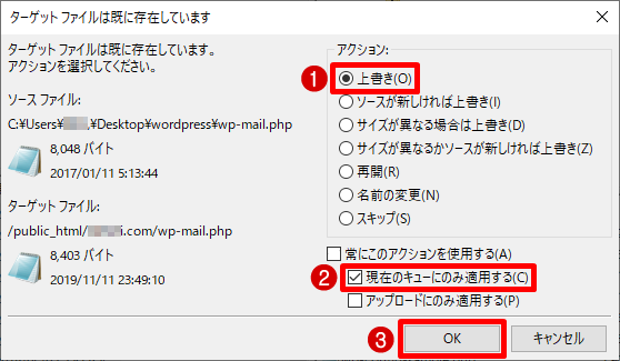 アップロード時に「ターゲットファイルは既に存在しています」と表示されますが、このポップアップでは上書き現在のキューにのみ適用する(c)にチェックを入れ、OKをクリックします。