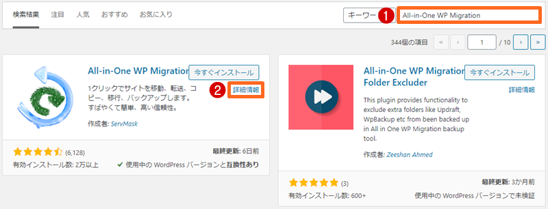 FTPソフトでインストールしたいプラグインを検索窓で検索し、詳細情報をクリックします。