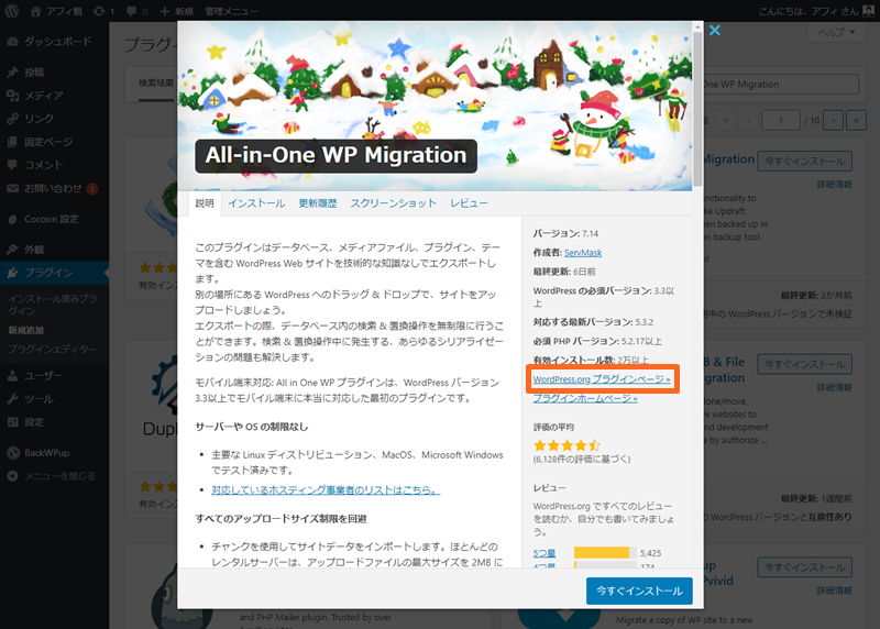 プラグイン詳細ページが開かれますので、WordPress.org プラグインページ »をクリックします。