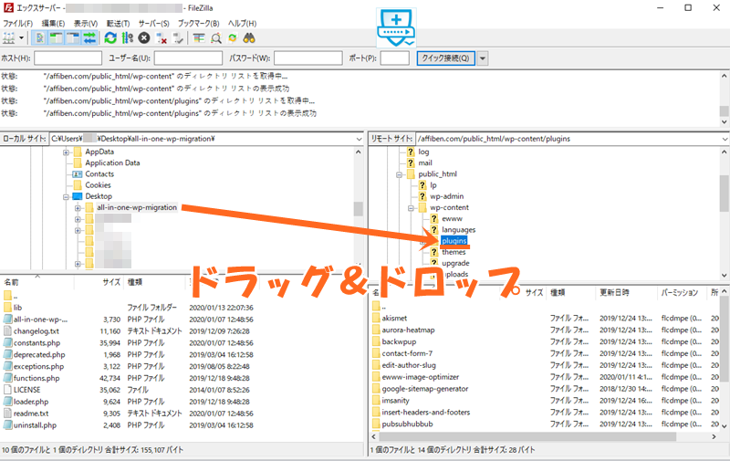 アップロード先はドメイン名>public_html>wp-content>pluginsです。