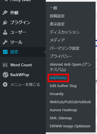 プラグインの有効化が完了したら、ダッシュボードのAddToAnyをクリックします。