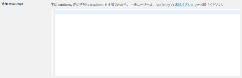 追加 JavaScriptでは、AddToAny Share ButtonsプラグインにJavaScriptを追加する際にここにコードを記述します。