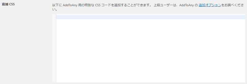 追加 CSSでは、AddToAny Share ButtonsプラグインにCSSを追加する際にここにコードを記述します。