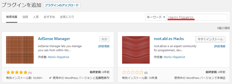 もしもプラグインが見付からないという人は、「AdSense Manager」ではなく、プラグイン製作者名の「Martin Fitzpatrick」で検索してみてください。