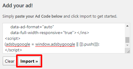 Add your ad!に自身のアドセンス広告コードをペーストして、Import >>をクリックします。
