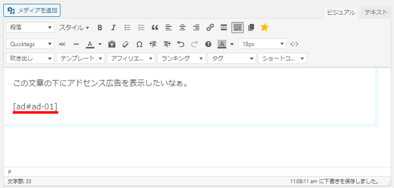 記事広告を挿入したいタイミングにアドセンス広告の呼び出しコードである、[ad#ad-01]を入力します。(#の後は先ほど決めた名前)
