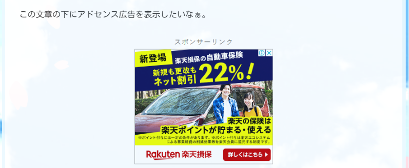 プレビュー画面で確認すると、このようにアドセンス広告が表示されました。