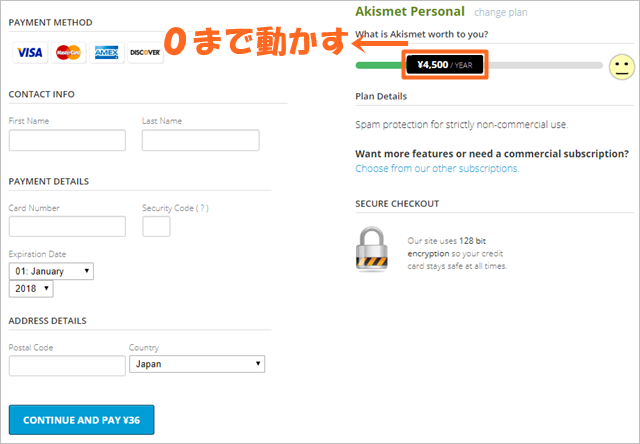 画面右上の「¥4,500/YEAR」と書かれたバーを、1番左まで動かして0にします。