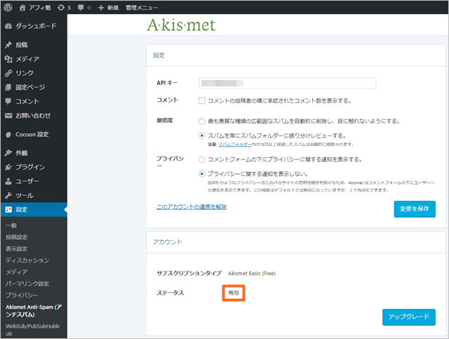 これだけでAkismet Anti-Spam (アンチスパム)の設定は完了です。