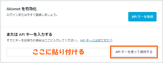 あとは、Akismet Anti-Spam (アンチスパム)の設定が終わっていないWordPressに切り替えて、そこに先程コピーしたAPIコードを貼り付けて、APIキーを使って接続するをクリックするだけ。