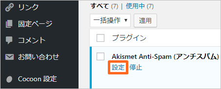まずは、既に設定が完了しているWordPressでAkismet Anti-Spam (アンチスパム)の設定をクリックします。