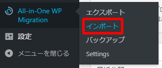 引っ越し先ブログのダッシュボードにログインし、All-in-One WP Migrationの中にあるインポートをクリックします。