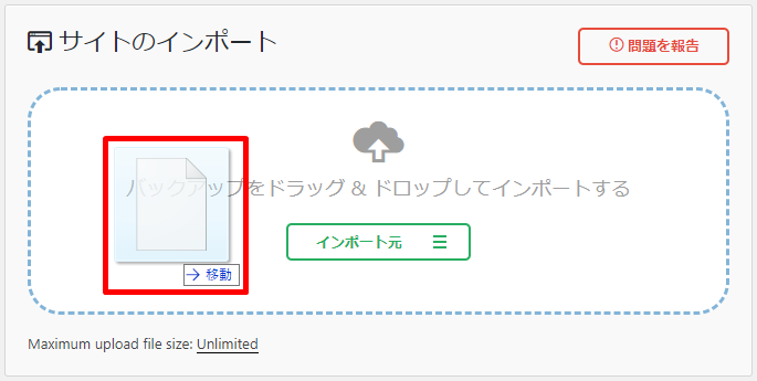 バックアップをドラッグ&ドロップしてインポートすると書かれたスペースに、先程ダウンロードした.wpressデータをドラッグ・アンド・ドロップします。