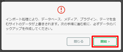 .wpressデータの読み込みが完了したら開始>をクリックします。
