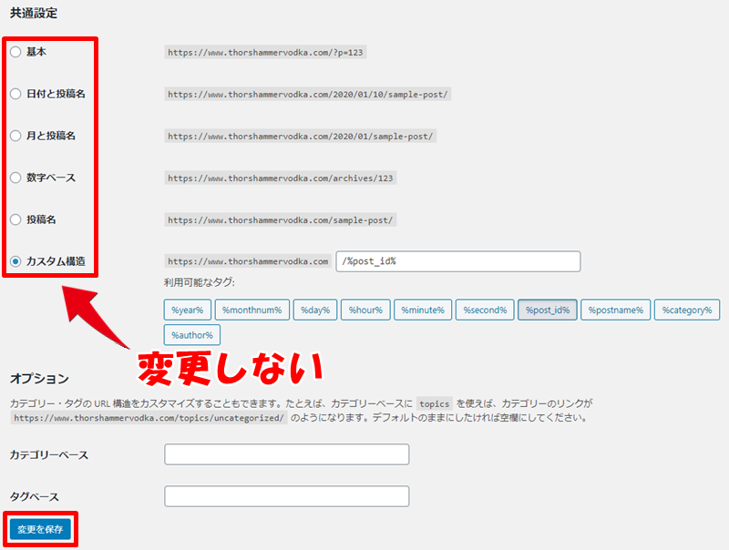 パーマリンク構造の編集画面が開かれますが、パーマリンク構造のラジオボタンは変更せずに変更を保存だけをクリックします。