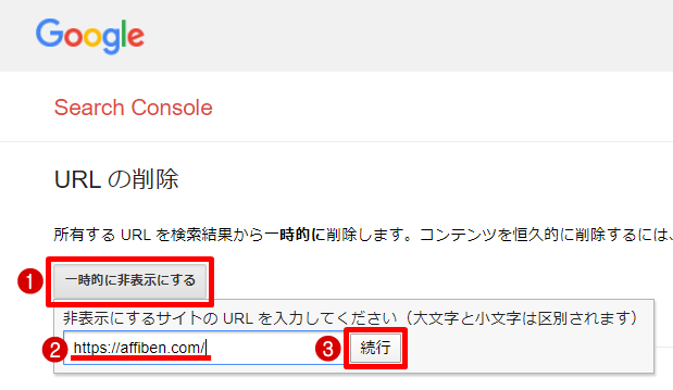 一時的に非表示にするをクリックし、引っ越し元ドメインのトップページのURLを入力後、続行をクリックします。