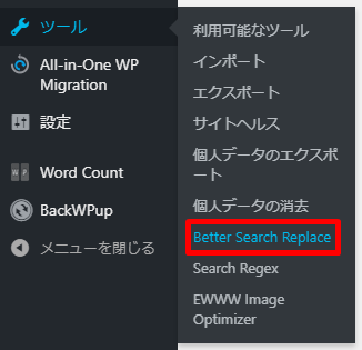 ダッシュボードのツールの中にある、Better Search Replaceをクリックします。