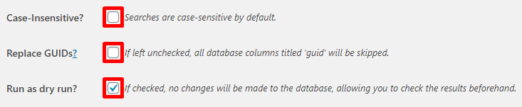 チェック欄に✓を入れて実行すると、実際にはデータベースを書き換えず、どこが置換対象になるかだけを事前に確認できます。