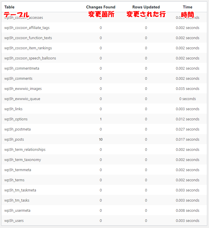 例えば、wp5h_postsというテーブルのChanges Foundの数字が10と表示されていますが、これは10個の投稿記事に置換前ワードが見つかったということになります。