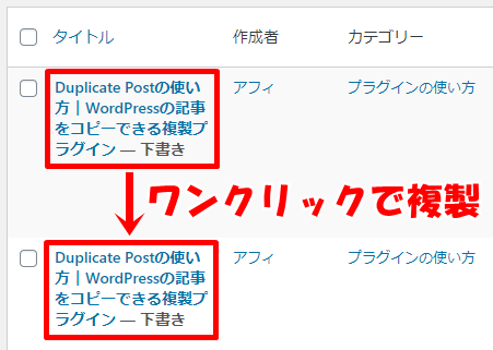 すると、複製元の記事のすぐ下に、複製された記事が下書きとして保存されます。