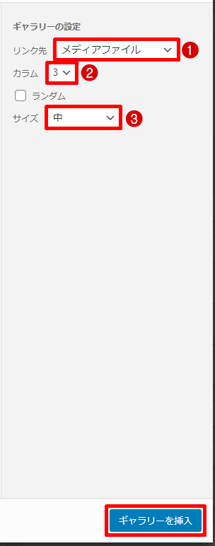 リンク先をメディアファイルに、カラム数は横並びに表示させる数をお好みで、サイズもお好みに変更し、ギャラリーを挿入をクリックします。
