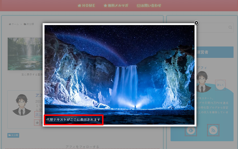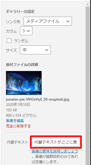 画像選択後、代替えテキストに画像拡大時に表示させたい文字を入力します。