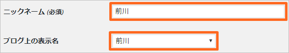一方、「表示名」は管理画面や投稿一覧に表示される名前で、日本語や記号を使うことも可能です。