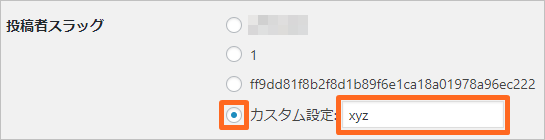 そして、その少し下にある「投稿者スラッグ」のカスタム設定をポチって、右側にテキトーな名前を入力します。