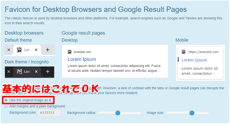 ファビコンの編集画面は、デフォルトだとUse the original image as is.にチェックが入っています。
