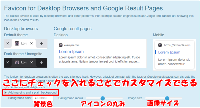 ファビコンをカスタマイズする場合には、Add margins and a plain background.にチェックを入れます。