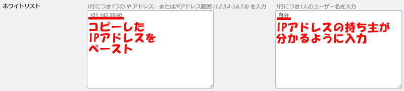 ホワイトリストの左側にコピーした自分のIPアドレスをペーストし、右側に誰のIPアドレスか判断できる名前を入力します。