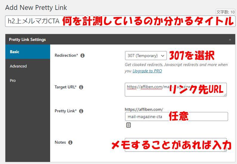 ⇒ここで入力した文字列がPretty Linkで生成したリンクになります。もともとデフォルトで何かしらの文字列が入力されているので、それをそのまま使っても問題ありません。 - Notes