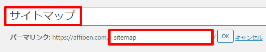 固定ページタイトルをサイトマップに、パーマリンク構造をsitemapに編集します。