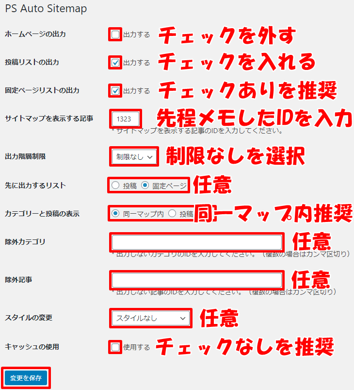 ⇒どのページにサイトマップを出力するか(先程メモした固定ページIDを入力)