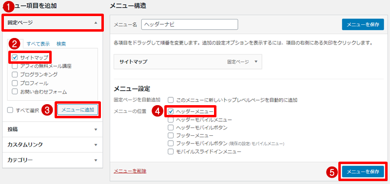 サイトマップページをメニューへ追加