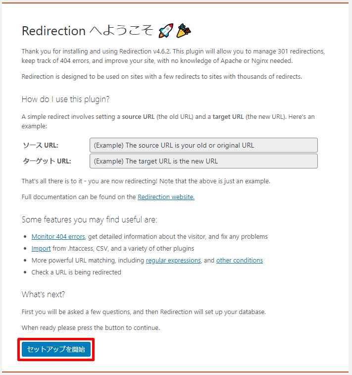 「Redirectionへようこそ」という画面が表示されますので、セットアップを開始をクリックします。