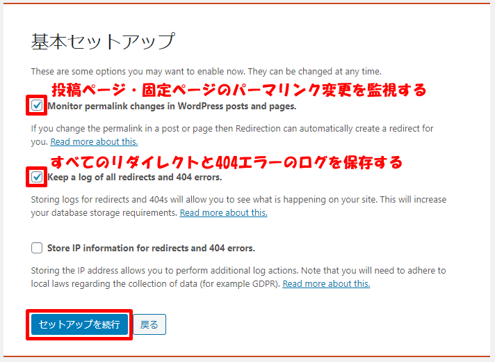 基本セットアップでは、上の2つにチェックを付けてセットアップを続行をクリックします。