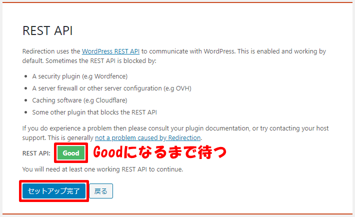 REST API:がGoodになるまで待ってから、セットアップ完了をクリックします。