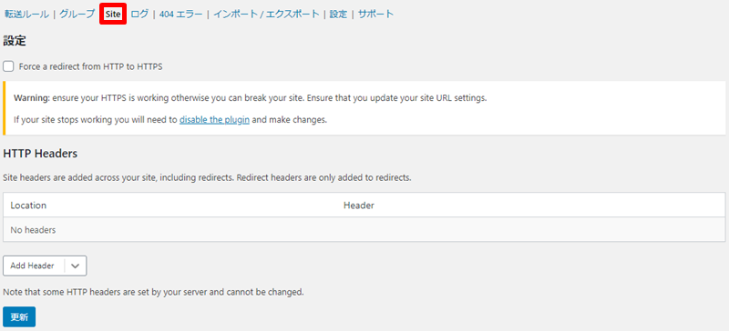 Siteのタブでは、httpからhttpsへのリダイレクト設定を行うことが可能です。