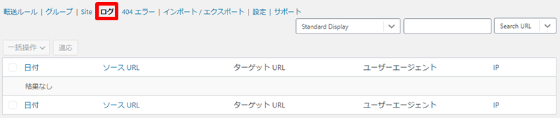 Redirectionではリダイレクトの実行状況を「ログ」タブで確認可能です。
