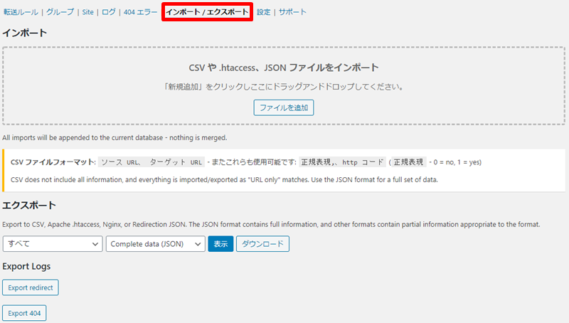 インポート/エクスポートのタブでは、CSVファイルを用いてリダイレクトデータを入力・出力することが可能です。