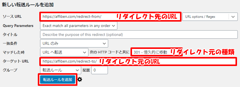 ソースURLにリダイレクト元のURL、ターゲットURLにリダイレクト先のURLを入力し、リダイレクトの種類を選択後、転送ルールを追加をクリックします。