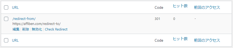 また、Redirectionプラグインではリダイレクト回数を記録しているため、管理画面のリストで数字が増えていれば設定が反映されています。