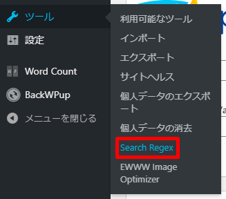 以上でインストールが完了し、管理画面のツールメニューに「Search Regex」が追加されます。
