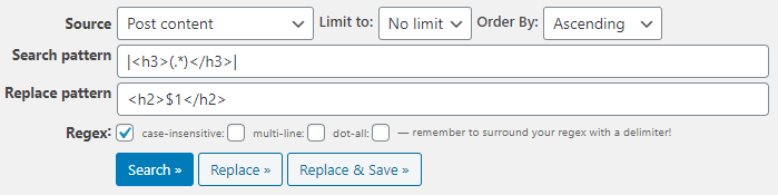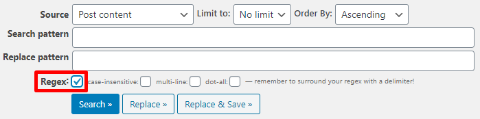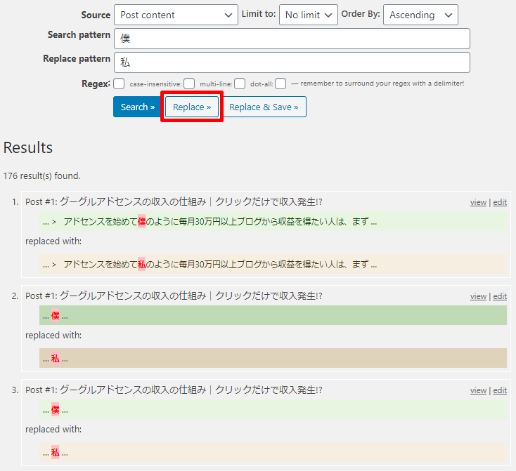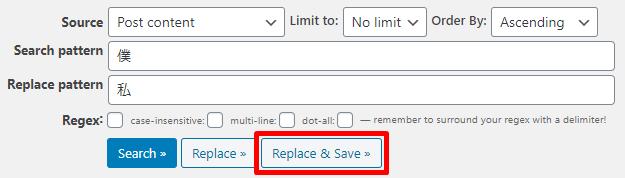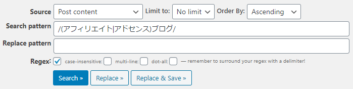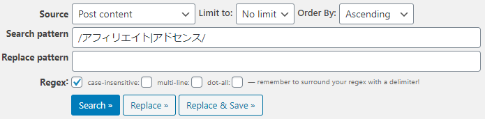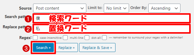 | Source | 検索や置換の対象範囲(投稿、固定ページ、コメントなど)を選択 |