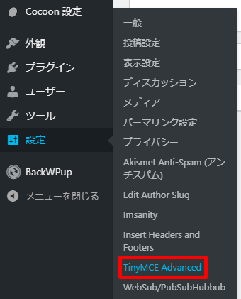 プラグインのインストール&有効化が完了したら、ダッシュボードの設定の中にあるTinyMCE Advancedをクリックします。