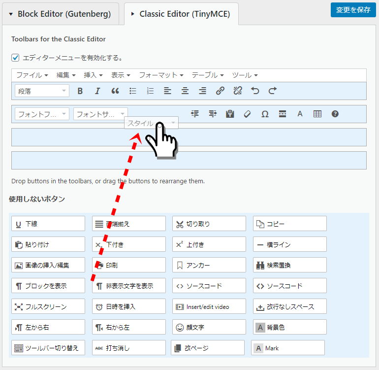 TinyMCE Advancedの管理画面では、表示するボタンを自由に追加したり、不要なものを非表示に設定したりできます。